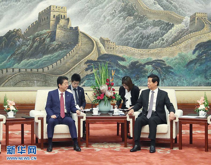 10月26日,全國(guó)人大常委會(huì)委員長(zhǎng)栗戰(zhàn)書在北京人民大會(huì)堂會(huì)見日本首相安倍晉三。 新華社記者劉衛(wèi)兵攝