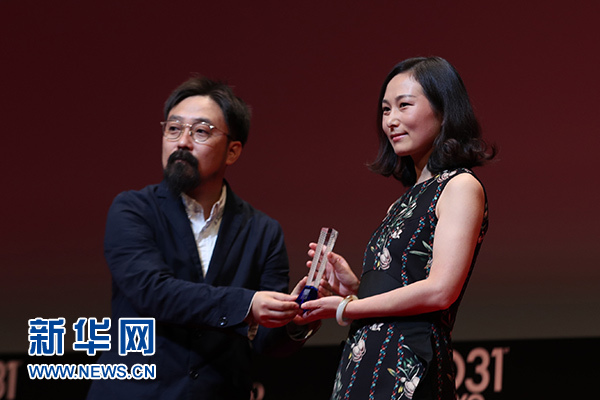 11月2日,在第31屆東京國際電影節(jié)頒獎典禮上,中國導演王麗娜(右)在作品《第一次的離別》獲“亞洲未來”單元最佳影片獎后上臺領獎。 新華社記者 杜瀟逸 攝