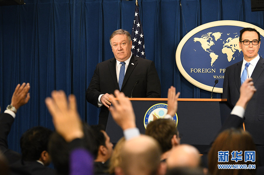 11月5日,在美國首都華盛頓,美國國務(wù)卿蓬佩奧(后左)和財政部長姆努欽(后右)出席記者會。 新華社記者劉杰攝