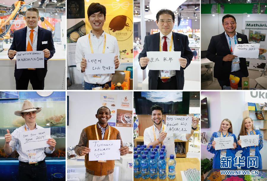 11月10日,進博會上不同國家的參展人員展示用不同語言書寫的“明年見”(拼版照片)。 首屆中國國際進口博覽會11月5日至10日在上海舉行。記者在采訪中了解到,很多參展商在進博會上收獲了不少訂單,宣傳了自己的產(chǎn)品,結識了很多朋友。他們表示,希望明年再來進博會。 新華社記者 侯東濤 攝