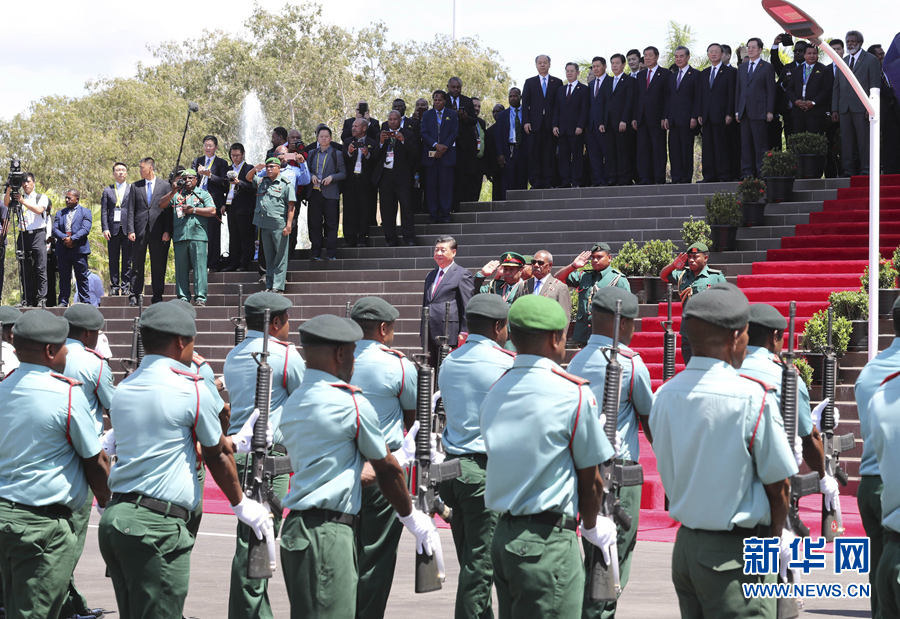 11月16日,國(guó)家主席習(xí)近平在莫爾茲比港會(huì)見(jiàn)巴布亞新幾內(nèi)亞總督達(dá)達(dá)埃。會(huì)見(jiàn)開(kāi)始前,達(dá)達(dá)埃在議會(huì)大廈前廣場(chǎng)為習(xí)近平舉行隆重歡迎儀式。新華社記者 丁林 攝