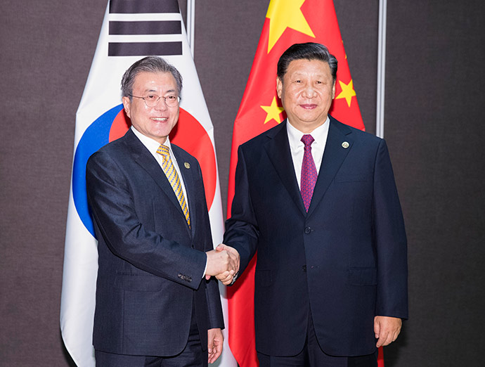 11月17日,國家主席習(xí)近平在莫爾茲比港會(huì)見韓國總統(tǒng)文在寅。新華社記者 龐興雷 攝
