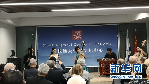 中央音樂學院教授、琵琶演奏家章紅艷和團隊在特拉維夫中國文化中心慶祝成立一周年活動上民樂合奏。新華社記者陳文仙攝
