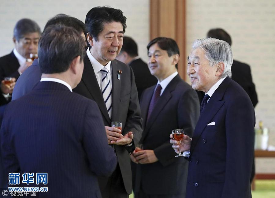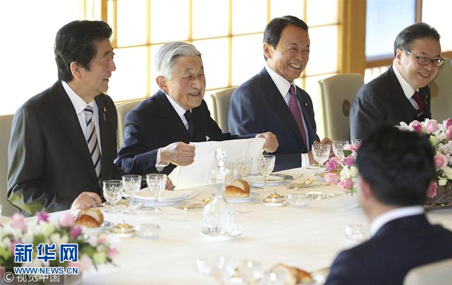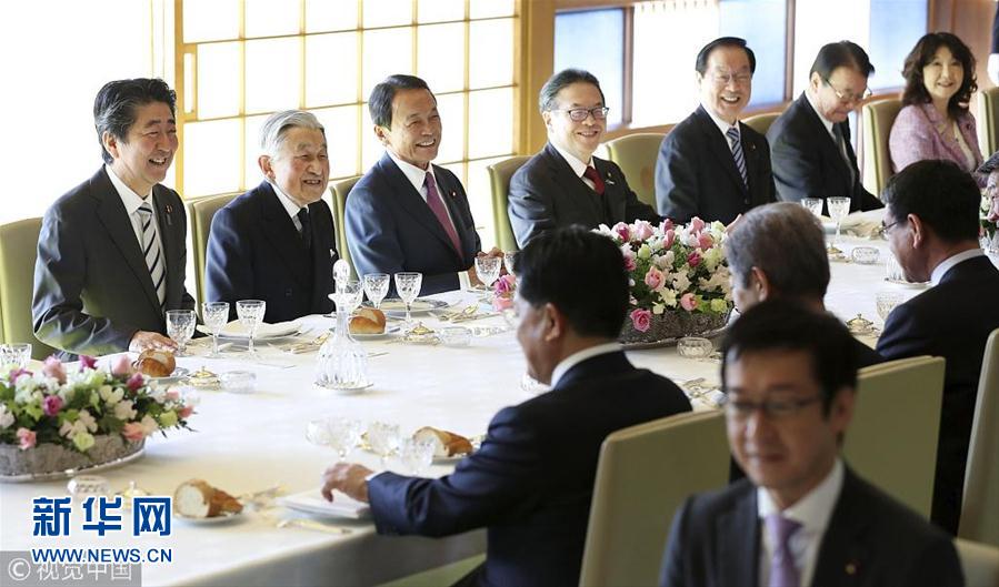當地時間2018年12月17日,日本東京,日本明仁天皇在皇宮與日本首相安倍晉三領導的政府高官共進年終午餐。(圖片來源:視覺中國)