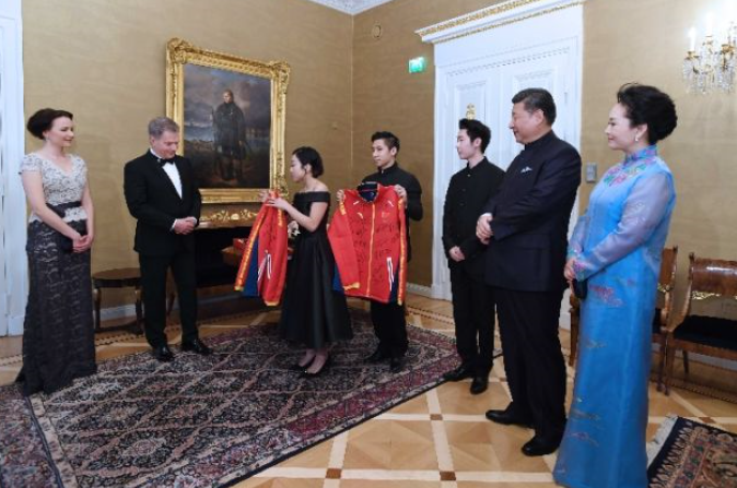 2017年4月訪問芬蘭期間,習(xí)近平主席同尼尼斯托總統(tǒng)共同會見剛剛參加完2017年世界花樣滑冰錦標(biāo)賽的中芬兩國冰雪運(yùn)動員代表。