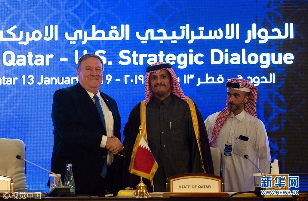 2019年1月13日,卡塔爾多哈,美國(guó)國(guó)務(wù)卿邁克·蓬佩奧訪問(wèn)卡塔爾。蓬佩奧與卡塔爾副首相兼外交大臣穆罕默德在多哈的喜來(lái)登大酒店簽署了諒解備忘錄和意向聲明并舉行聯(lián)合記者會(huì)。蓬佩奧表示,兩國(guó)外交部門(mén)領(lǐng)導(dǎo)人當(dāng)天簽署了一份諒解備忘錄,將擴(kuò)建和改造烏代德美國(guó)空軍基地。(圖片來(lái)源:視覺(jué)中國(guó))