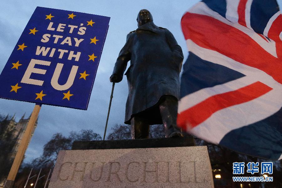 1月15日,在英國倫敦,民眾在議會大廈外的英國前首相丘吉爾雕像前參加集會。 英國議會下院15日投票否決了此前英國政府與歐盟達成的“脫歐”協(xié)議。在經(jīng)過5天辯論后,英國議會下院15日以432票反對、202票支持的投票結(jié)果否決了“脫歐”協(xié)議。 新華社發(fā)(蒂姆·愛爾蘭攝)