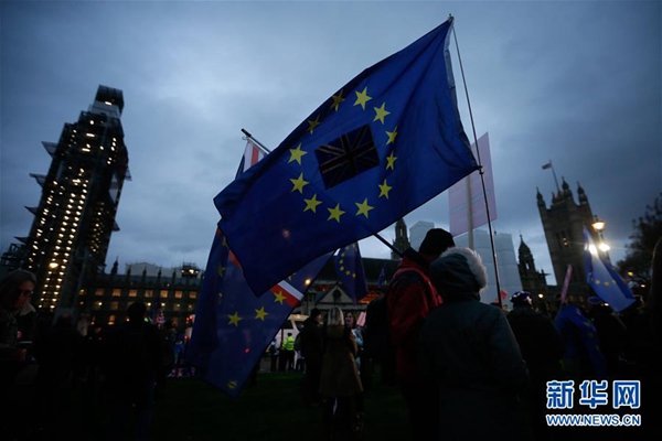 這是1月15日在英國倫敦議會大廈外拍攝的示威者揮舞的英國和歐盟旗幟。 新華社發(fā)(蒂姆·愛爾蘭攝)