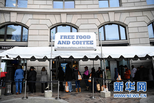 1月23日,在美國首都華盛頓,一些聯(lián)邦政府雇員在一家公益組織的“應急食堂”外排隊領取免費餐。 新華社記者 劉杰 攝
