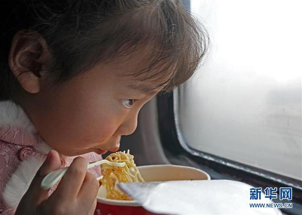1月21日,在中國(guó)鐵路哈爾濱局集團(tuán)有限公司齊齊哈爾客運(yùn)段K497次列車上,一名小女孩在窗邊吃方便面。 新華社記者 才揚(yáng) 攝