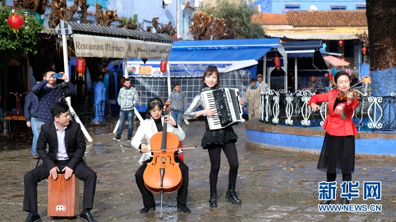 2月1日,在摩洛哥“藍(lán)色小鎮(zhèn)”舍夫沙萬(wàn),重慶市歌劇院的演員們進(jìn)行快閃表演。新華社記者陳斌杰 攝