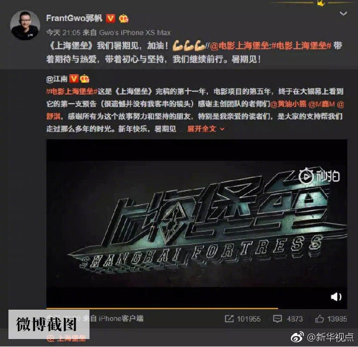 郭帆日前就在微博上轉(zhuǎn)發(fā)了科幻電影《上海堡壘》首個宣傳片,并表達對影片的期待。此片也是由《流浪地球》聯(lián)合出品方之一的騰訊影業(yè)參與出品,預(yù)計將于今年暑期上映。這種“抱團取暖”的作法也讓不少科幻迷在網(wǎng)上津津樂道。