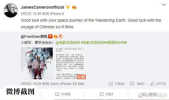 正如好萊塢大導(dǎo)演詹姆斯·卡梅隆在社交媒體上對《流浪地球》發(fā)出的祝愿:“祝中國科幻電影之旅好運!”