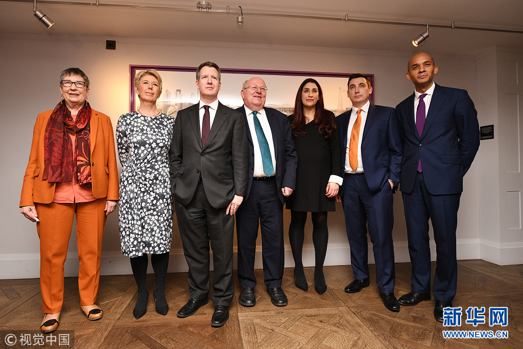 當(dāng)?shù)貢r間2019年2月18日,英國倫敦,英國反對黨工黨的7名議員宣布從工黨辭職,他們將組成一個新的國會議員獨(dú)立團(tuán)體,以抗議該黨對英國“脫歐”的支持,以及未能根除反猶太主義。(圖片來源:視覺中國)