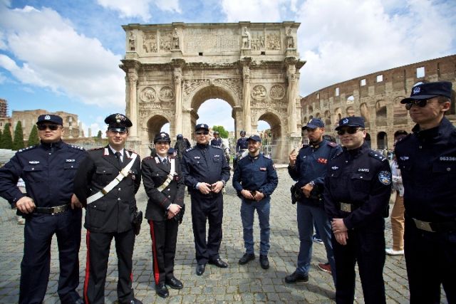 2016年5月2日,中意首次聯(lián)合警務(wù)巡邏在意大利羅馬啟動(dòng)。在意大利羅馬君士坦丁凱旋門(mén)外,中方警員與意方警員合影。新華社記者金宇攝