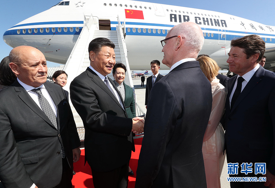 當?shù)貢r間中午12時許,習近平乘坐的專機抵達尼斯機場。習近平和夫人彭麗媛受到摩納哥政府首腦、國務(wù)大臣泰爾,摩納哥對外關(guān)系與合作大臣托內(nèi)利熱情迎接。法國外長勒德里昂也到機場迎接。習近平和彭麗媛沿紅地毯前行,禮兵分列紅地毯兩側(cè),行注目禮。