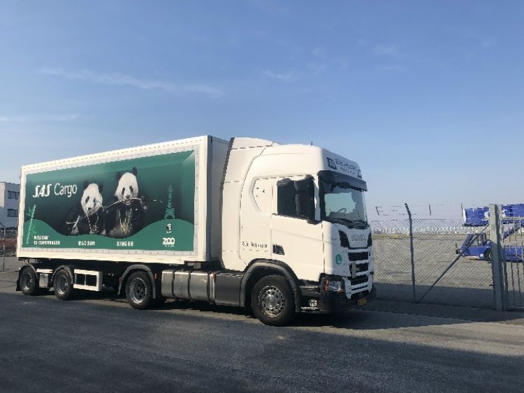 4月4日,在丹麥?zhǔn)锥几绫竟膭P斯楚普國際機(jī)場,一輛印有歡迎“星二”和“毛筍”(“毛二”的乳名)來哥本哈根字樣的集裝箱卡車等待運(yùn)送大熊貓。(新華社發(fā) 何李杰攝)
