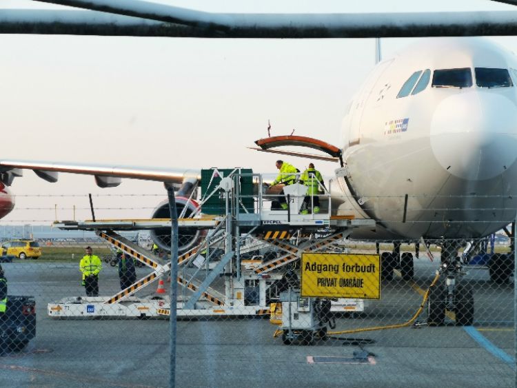 4月4日,在丹麥?zhǔn)锥几绫竟膭P斯楚普國際機(jī)場,工作人員將裝有中國大熊貓的箱子搬出,準(zhǔn)備運(yùn)往哥本哈根動(dòng)物園。(新華社發(fā) 李鵬飛攝)