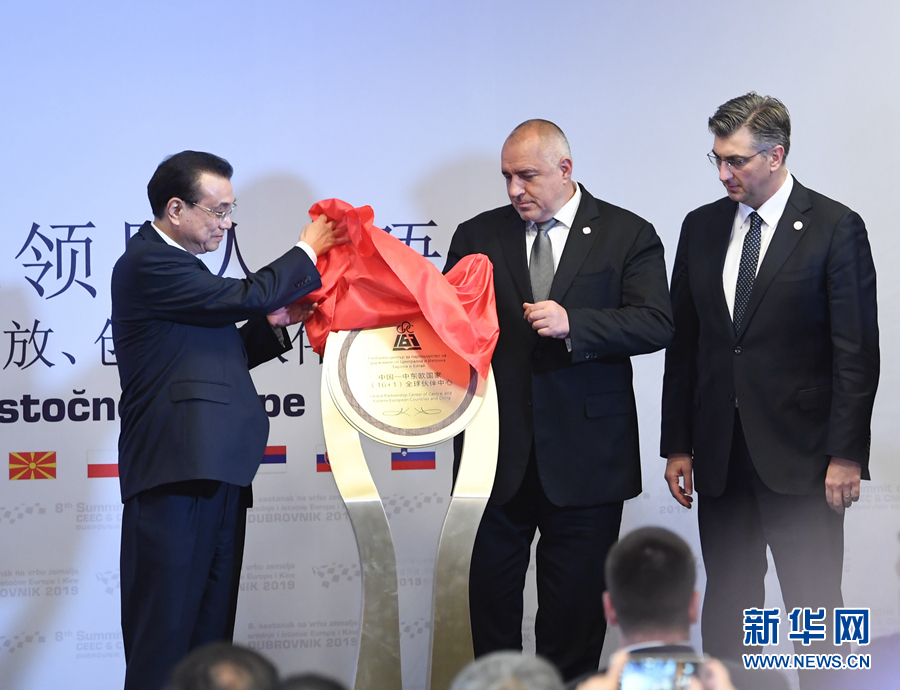 當(dāng)?shù)貢r間4月12日下午,國務(wù)院總理李克強在杜布羅夫尼克出席第八次中國-中東歐國家領(lǐng)導(dǎo)人會晤后,與保加利亞總理鮑里索夫、克羅地亞總理普連科維奇共同為“16+1全球伙伴中心”揭牌,宣布“16+1全球伙伴中心”正式成立。新華社記者 申宏 攝