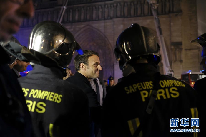 4月15日,在法國(guó)巴黎,法國(guó)總統(tǒng)馬克龍(中)在火災(zāi)現(xiàn)場(chǎng)視察。新華社發(fā)(亞歷山大·卡曼 攝)