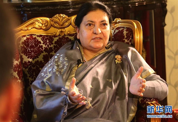 4月18日,在尼泊爾首都加德滿都總統(tǒng)府,尼泊爾總統(tǒng)比迪亞·德維·班達里接受中國媒體記者聯合采訪。新華社發(fā)(蘇尼爾·夏爾馬 攝)