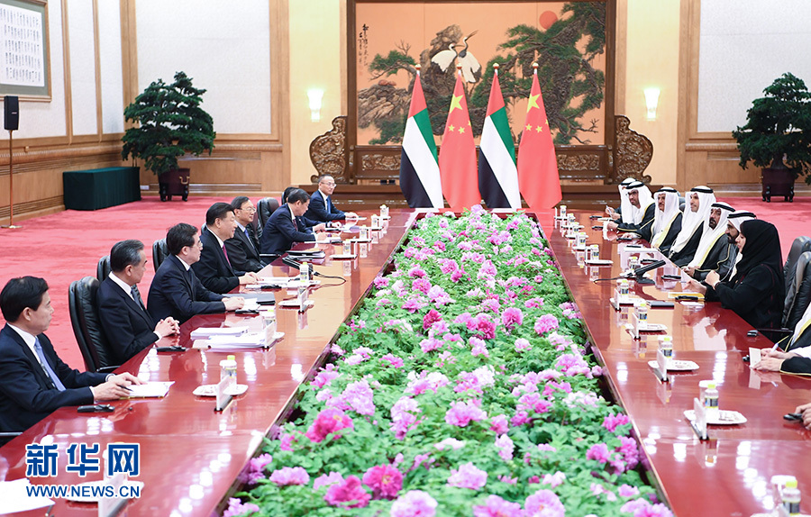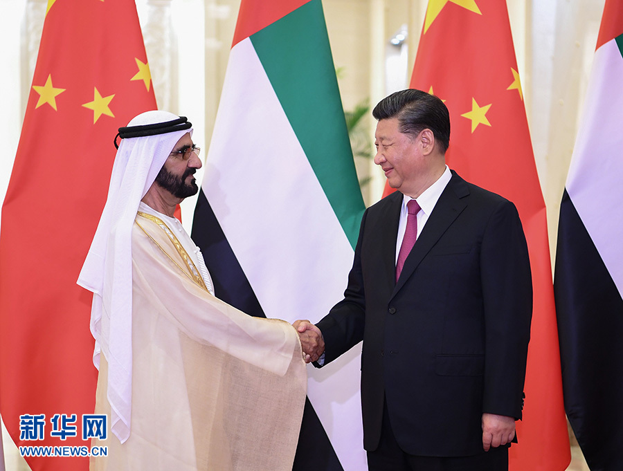 習(xí)近平指出,去年7月我訪問阿聯(lián)酋期間,兩國宣布建立全面戰(zhàn)略伙伴關(guān)系,揭開中阿關(guān)系發(fā)展新篇章。中方視阿聯(lián)酋為共建“一帶一路”的重要合作伙伴。雙方要穩(wěn)步推進以能源合作為主軸、以投資和基礎(chǔ)設(shè)施建設(shè)為兩翼、以高新技術(shù)為增長點的務(wù)實合作。下階段要對接創(chuàng)新發(fā)展戰(zhàn)略,打造兩國合作新增長點。要深化打擊恐怖主義和極端勢力等安全領(lǐng)域合作,共同維護兩國和地區(qū)安全穩(wěn)定。副總統(tǒng)先生提出的“擁抱中國”計劃深受阿聯(lián)酋民眾歡迎,要不懈推動兩國人文交流。中方支持阿方明年舉辦中東地區(qū)首屆世博會。