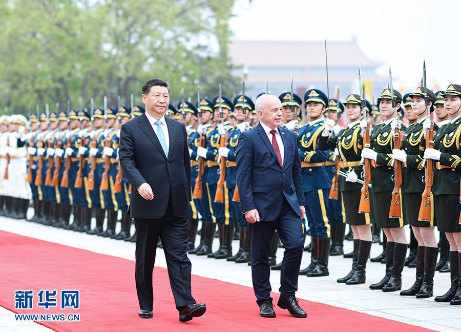 4月29日,國家主席習(xí)近平在北京人民大會堂同瑞士聯(lián)邦主席毛雷爾舉行會談。這是會談前,習(xí)近平在人民大會堂東門外廣場為毛雷爾舉行歡迎儀式。 新華社記者 謝環(huán)馳 攝