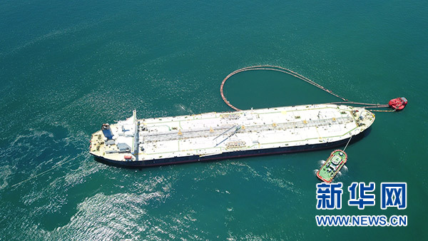 5月3日,一艘油輪在文萊海面上接卸恒逸石化大摩拉島綜合煉化項(xiàng)目所需原油(航拍照片)。 新華社發(fā)(恒逸實(shí)業(yè)供圖)