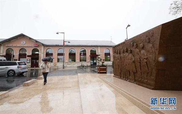 5月4日,在距法國巴黎100多公里的小城蒙塔日,《百年豐碑》大型雕塑被安放在火車站前的鄧小平廣場。新華社記者 高靜 攝