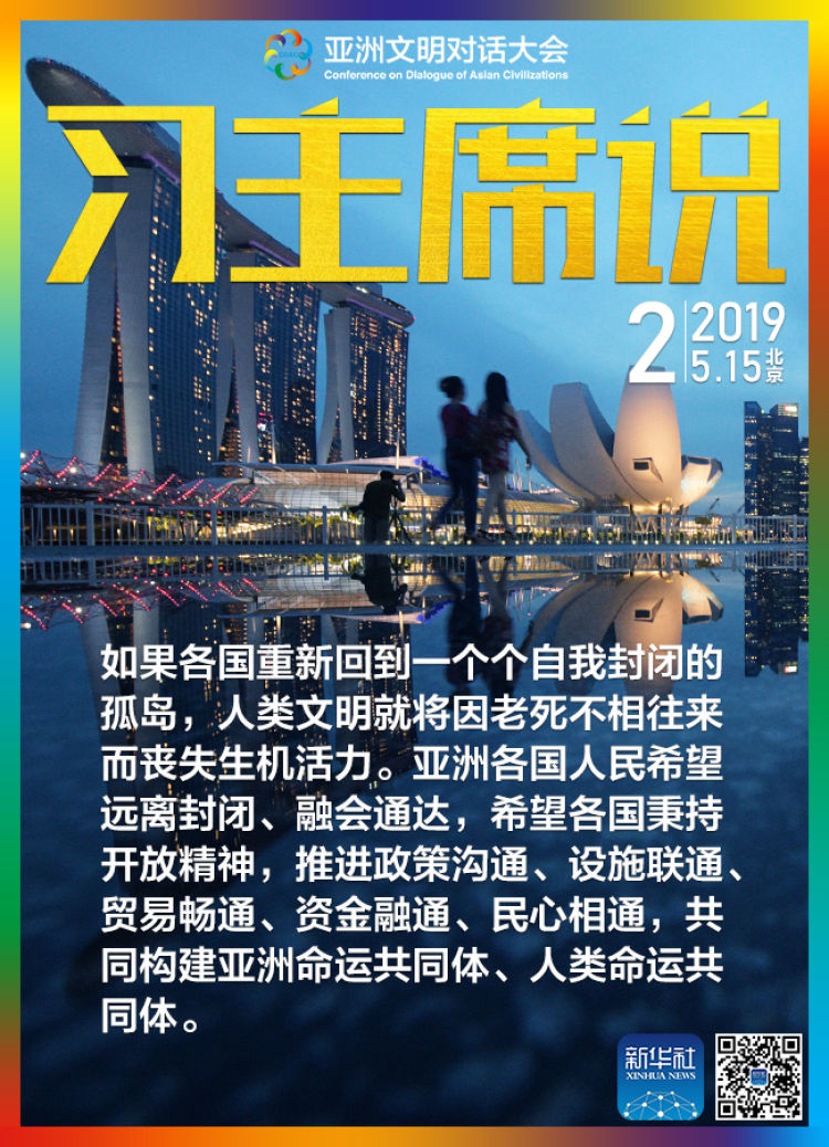 如果各國重新回到一個(gè)個(gè)自我封閉的孤島,人類文明就將因老死不相往來而喪失生機(jī)活力。亞洲各國人民希望遠(yuǎn)離封閉、融會(huì)通達(dá),希望各國秉持開放精神,推進(jìn)政策溝通、設(shè)施聯(lián)通、貿(mào)易暢通、資金融通、民心相通,共同構(gòu)建亞洲命運(yùn)共同體、人類命運(yùn)共同體。