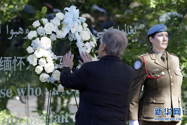 悼念活動上午9時開始,聯(lián)合國秘書長古特雷斯向維和人員紀(jì)念碑敬獻(xiàn)花圈并致辭。