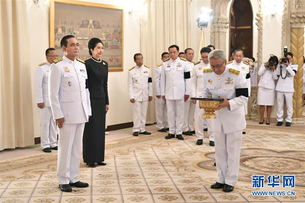 6月11日,在泰國曼谷,相關(guān)工作人員來到總理府對泰國總理巴育(前左)宣讀國王圣諭。新華社發(fā)