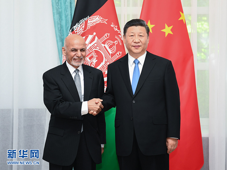 6月13日,國家主席習近平在比什凱克會見阿富汗總統(tǒng)加尼。 新華社記者 謝環(huán)馳 攝