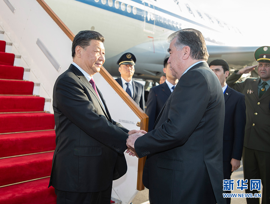 當(dāng)?shù)貢r(shí)間晚6時(shí)許,習(xí)近平乘坐的專機(jī)抵達(dá)杜尚別國(guó)際機(jī)場(chǎng)。習(xí)近平步出艙門,受到塔吉克斯坦總統(tǒng)拉赫蒙熱情迎接。塔吉克斯坦女青年向習(xí)近平獻(xiàn)花。禮兵分列紅地毯兩側(cè)。