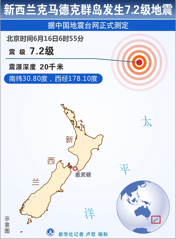 新華社快訊:中國地震臺(tái)網(wǎng)正式測(cè)定,6月16日6時(shí)55分,在新西蘭克馬德克群島(南緯30.8度,西經(jīng)178.1度)發(fā)生7.2級(jí)地震,震源深度20公里。