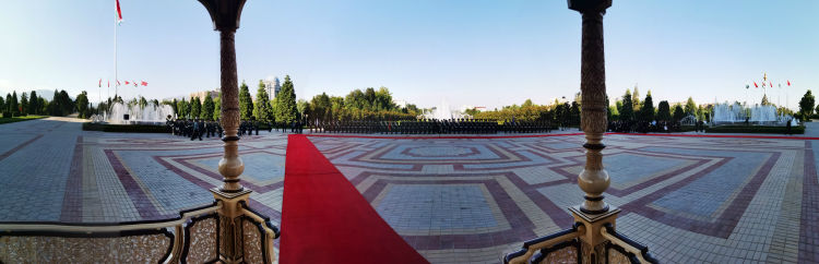 儀仗隊在塔吉克斯坦總統(tǒng)府列隊,等候兩國元首檢閱。遠(yuǎn)處高聳的旗桿位于總統(tǒng)府外的國旗公園,高165米,是杜尚別的地標(biāo)建筑之一。新華社記者 霍小光 攝
