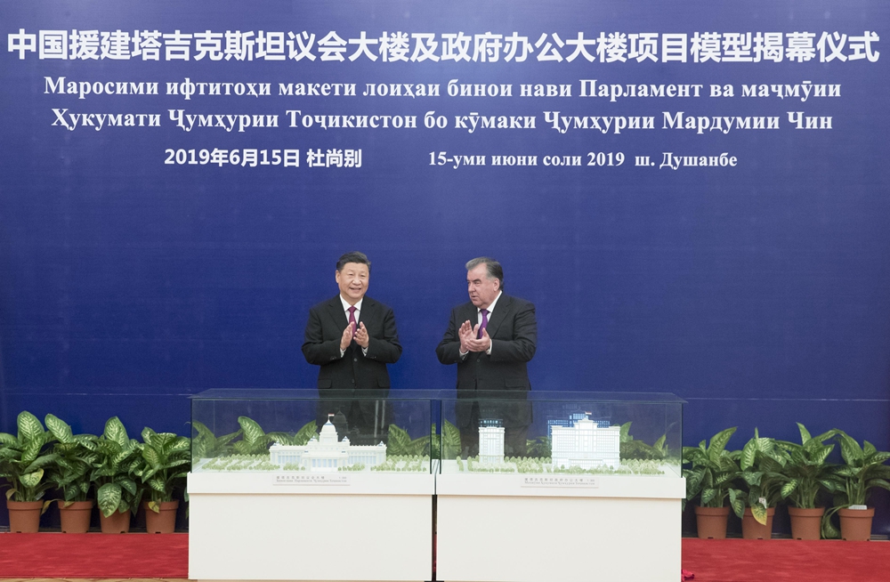 6月15日,國家主席習(xí)近平在杜尚別同塔吉克斯坦總統(tǒng)拉赫蒙會談。會談后,兩國元首共同出席中方援塔議會大樓、政府辦公大樓項目模型揭幕儀式。新華社記者 王曄 攝