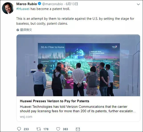 作為美國反華政客中最激進最極端的一個人,盧比奧多次叫嚷中國“偷”美國“知識產(chǎn)權(quán)”。但是聽到這個消息后,他立馬撤下了那套“捍衛(wèi)者”的偽裝,給合理維權(quán)的華為扣上“專利流氓”的帽子,還宣稱華為的專利都是“沒有依據(jù)”的。