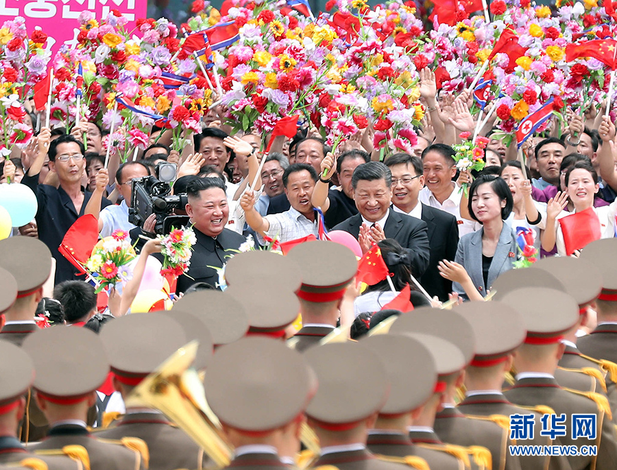 歡迎儀式結(jié)束后,在21輛禮賓摩托車的護(hù)衛(wèi)下,習(xí)近平乘車前往錦繡山迎賓館。沿途數(shù)十萬群眾揮舞中朝兩國國旗和五彩繽紛的鮮花,熱情洋溢地高呼中朝友誼萬歲等口號,夾道歡迎。