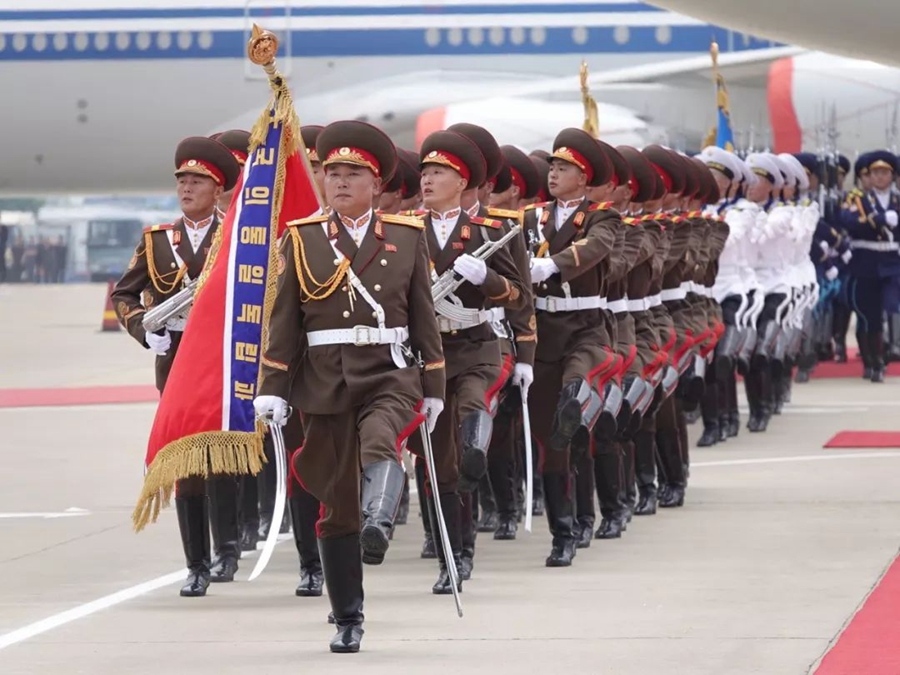 朝方在機場舉行隆重歡迎儀式。在21響禮炮聲中,軍樂隊奏中朝兩國國歌,習近平在金正恩陪同下檢閱了朝鮮人民軍三軍儀仗隊,并觀看了分列式表演。