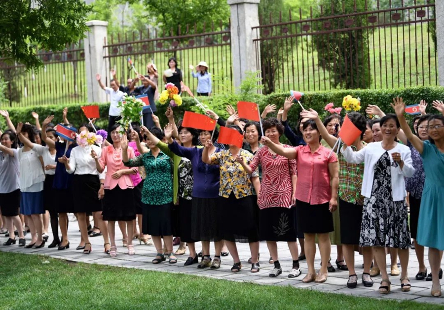 到處都是熱情的笑臉,友好的歡呼聲不絕于耳。習近平和金正恩向歡迎的人群頻頻揮手致意。