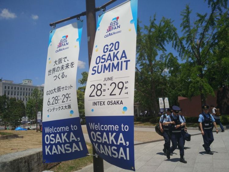 入夏的大阪,驕陽燦爛,綠意蔥蘢,海風(fēng)輕拂路人。隨著峰會臨近,在大阪主要景區(qū)、酒店、商廈及干道,均可以看到帶有二十國集團領(lǐng)導(dǎo)人大阪峰會元素的標(biāo)牌、海報和條幅。