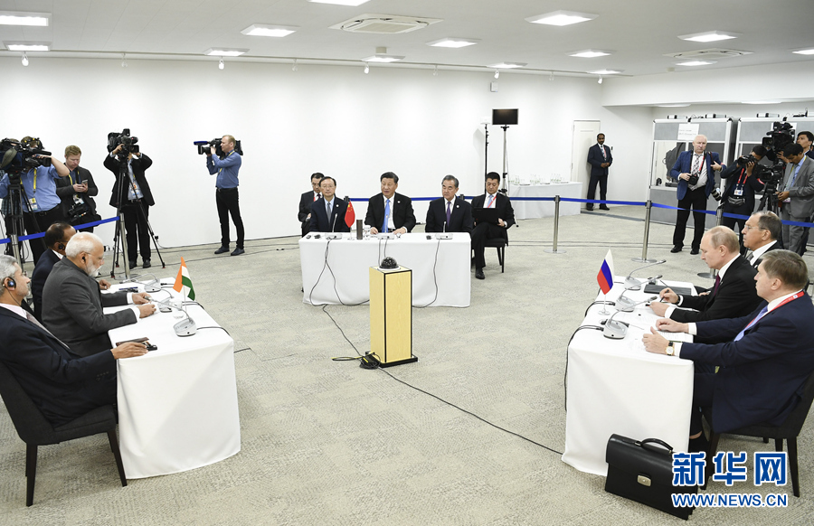 6月28日,國(guó)家主席習(xí)近平在大阪出席中俄印領(lǐng)導(dǎo)人會(huì)晤,同俄羅斯總統(tǒng)普京、印度總理莫迪就當(dāng)前國(guó)際形勢(shì)、重大國(guó)際和地區(qū)問(wèn)題、三方合作深入交換意見(jiàn)。 新華社記者 謝環(huán)馳 攝