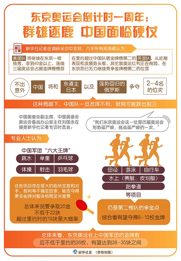 美國一家獨大、日本雄心勃勃、俄羅斯勵精圖治、英國余威仍在,五強逐鹿東京的格局下,中國奧運軍團如逆水行舟,進可與日俄上演“爭二”大戰(zhàn);稍有不慎,也可能跌出金牌榜前三。