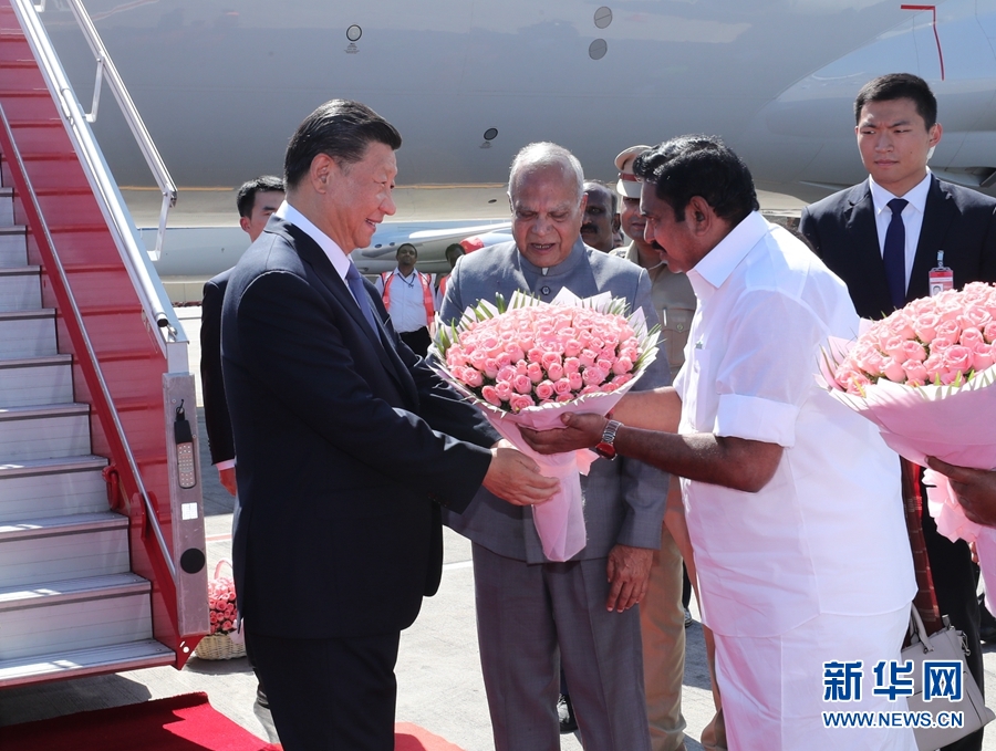 10月11日,國家主席習(xí)近平乘專機(jī)抵達(dá)金奈,應(yīng)印度共和國總理莫迪邀請(qǐng),出席中印領(lǐng)導(dǎo)人第二次非正式會(huì)晤。印度泰米爾納德邦邦長(zhǎng)普羅希特、首席部長(zhǎng)帕拉尼斯瓦米等在舷梯旁迎接,向習(xí)近平敬獻(xiàn)鮮花。 新華社記者 鞠鵬 攝