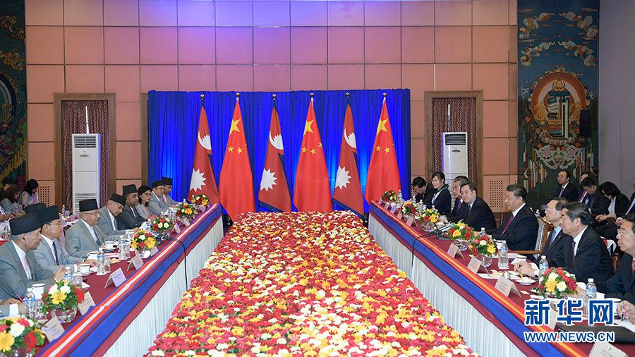 10月13日,國(guó)家主席習(xí)近平在加德滿都同尼泊爾總理奧利會(huì)談。 新華社記者 鞠鵬 攝