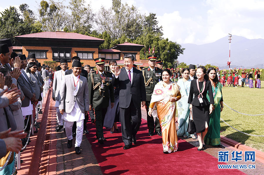 10月的加德滿都,陽光燦爛,云卷風(fēng)舒。喜馬拉雅山巍峨聳立,見證著尼泊爾人民對中國領(lǐng)導(dǎo)人的深情厚誼。習(xí)近平抵達機場,班達里總統(tǒng)上前迎接。盛裝的尼泊爾藝術(shù)家載歌載舞,少年兒童手持中尼兩國國旗,用中文歡呼“習(xí)爺爺再見!”“我們愛您!”“歡迎您再次訪問尼泊爾!”。習(xí)近平向歡送人群不時揮手致意。