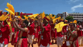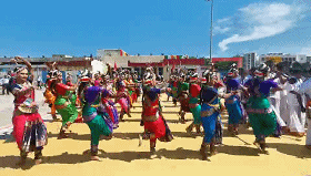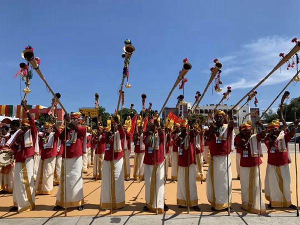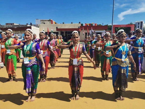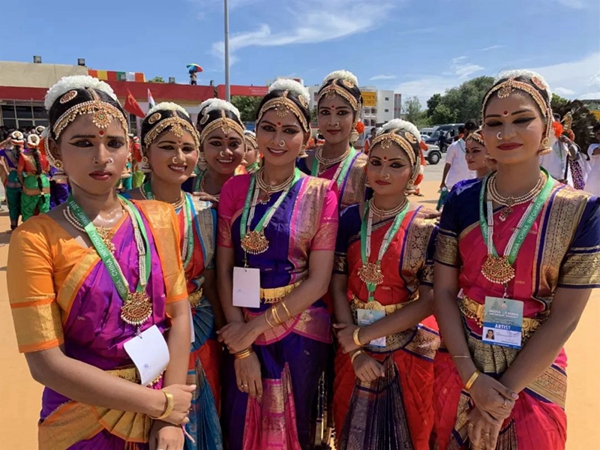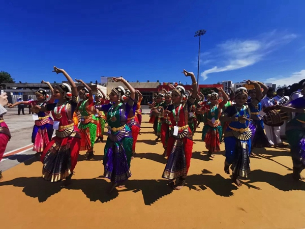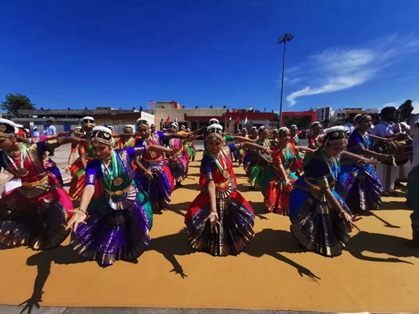 民眾們載歌載舞,有人跳起婆羅多舞,有人踩高蹺、劃旱船,盛情歡迎習(xí)主席的到來(lái)。