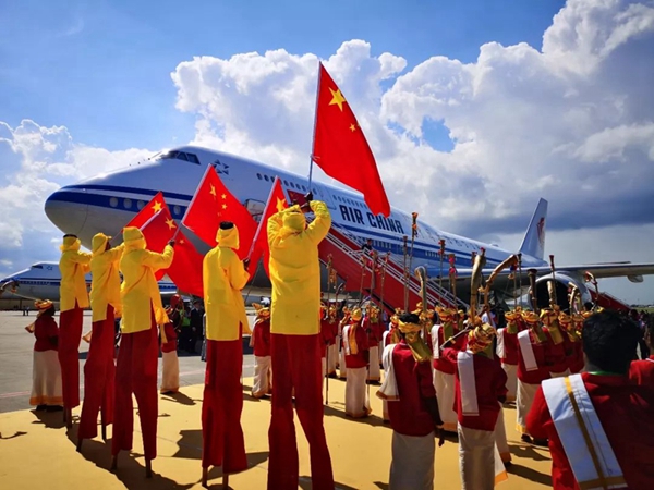 金奈國(guó)際機(jī)場(chǎng)內(nèi),鮮花紅毯相襯,當(dāng)?shù)孛癖娕懦刹煌年嚵?,等候?xí)主席的到來(lái)。