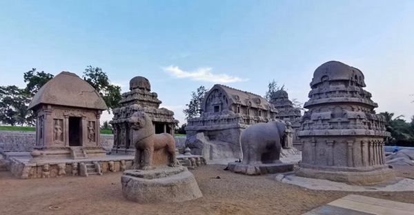五戰(zhàn)車(chē)神廟于公元7世紀(jì)所建,均由整塊花崗巖從上至下鑿刻而成。每座建筑形態(tài)各異,分別代表印度史詩(shī)《摩訶婆羅多》中的五位王子和黑公主的座輦。1984年列入聯(lián)合國(guó)世界文化遺產(chǎn)名錄。新華社記者王曄攝